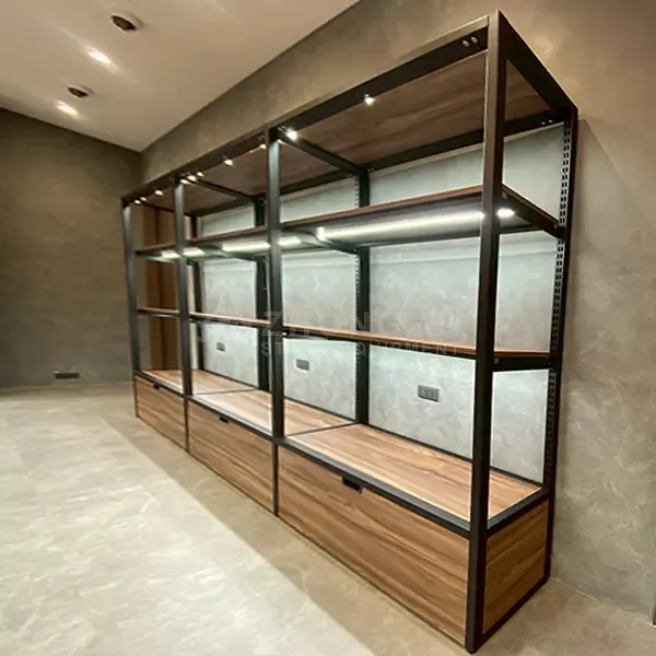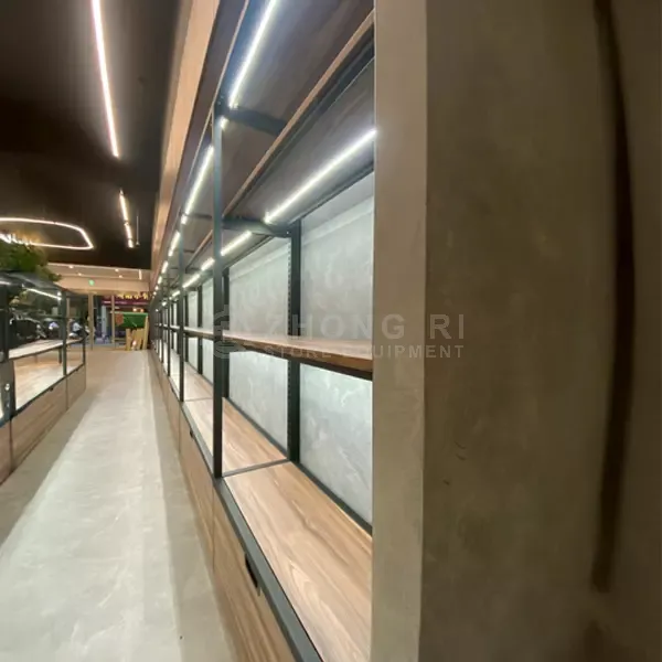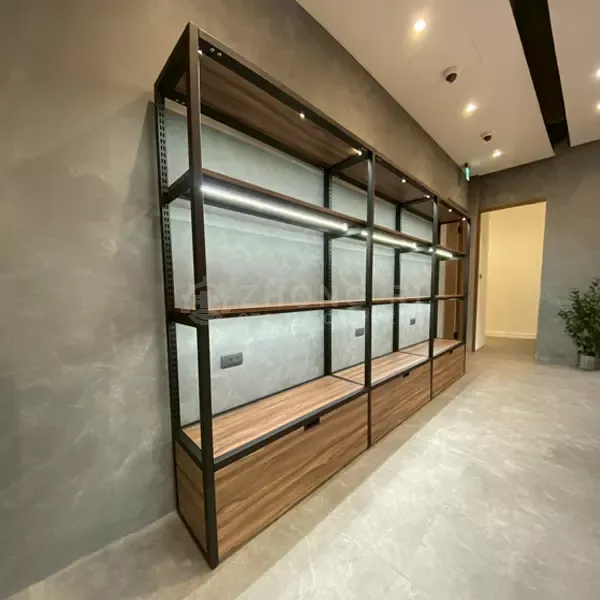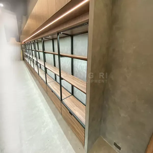 簡潔俐落的展示櫃結構,搭配霧黑烤漆鋼柱與溫潤木頭層板,營造沉靜且具層次感的展示空間。設計聚焦於空間的秩序與延伸感,讓牆面不只是背景,而是能夠引導視線、提升商品價值的場域。壁面架層板高度靈活調整,搭配隱藏式收納櫃,提升展示彈性與空間機能。