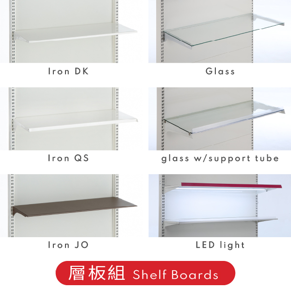 Types of shelf board: iron DK, iron QS, iron JO, glass, glass w/support tube, LED light shelf
