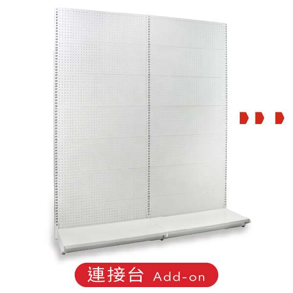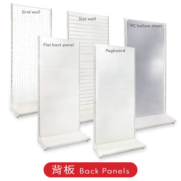 Types of back panels: grid wall, flat back panel, pegboard, slat wall, PC hollow sheet