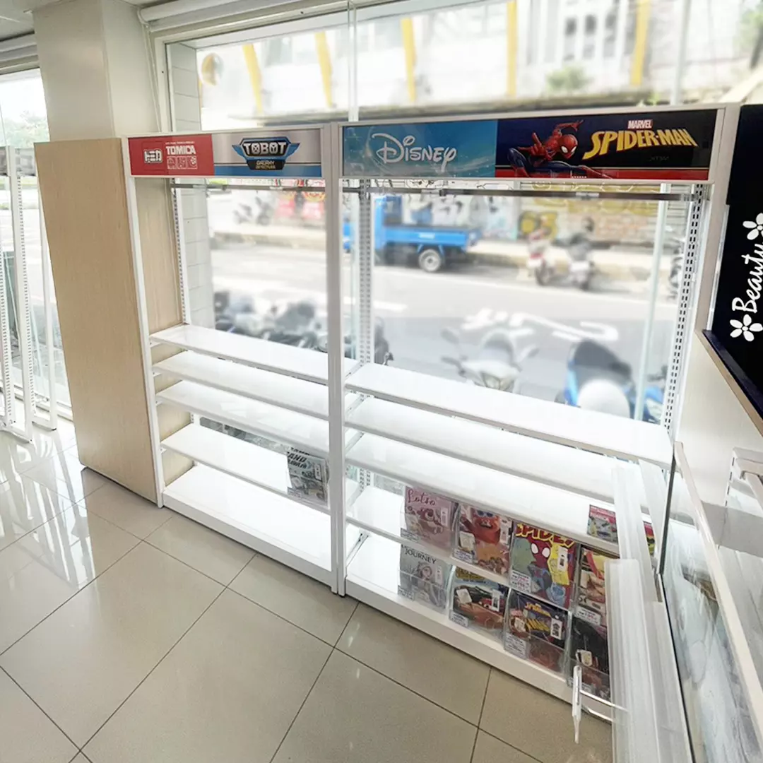 明亮通透設計:白色高亮材質與玻璃窗,讓商品在光線中更顯出色。