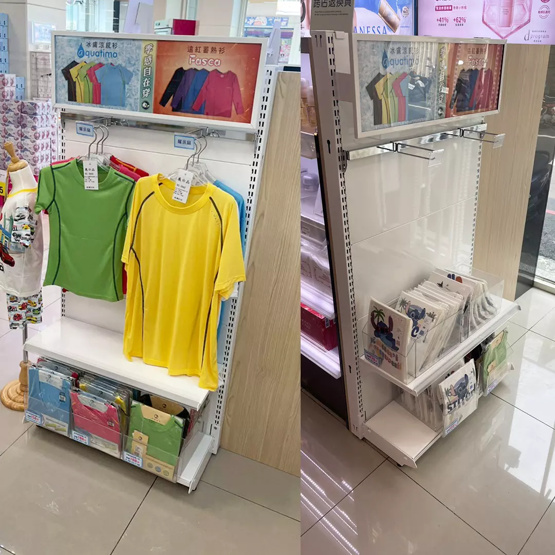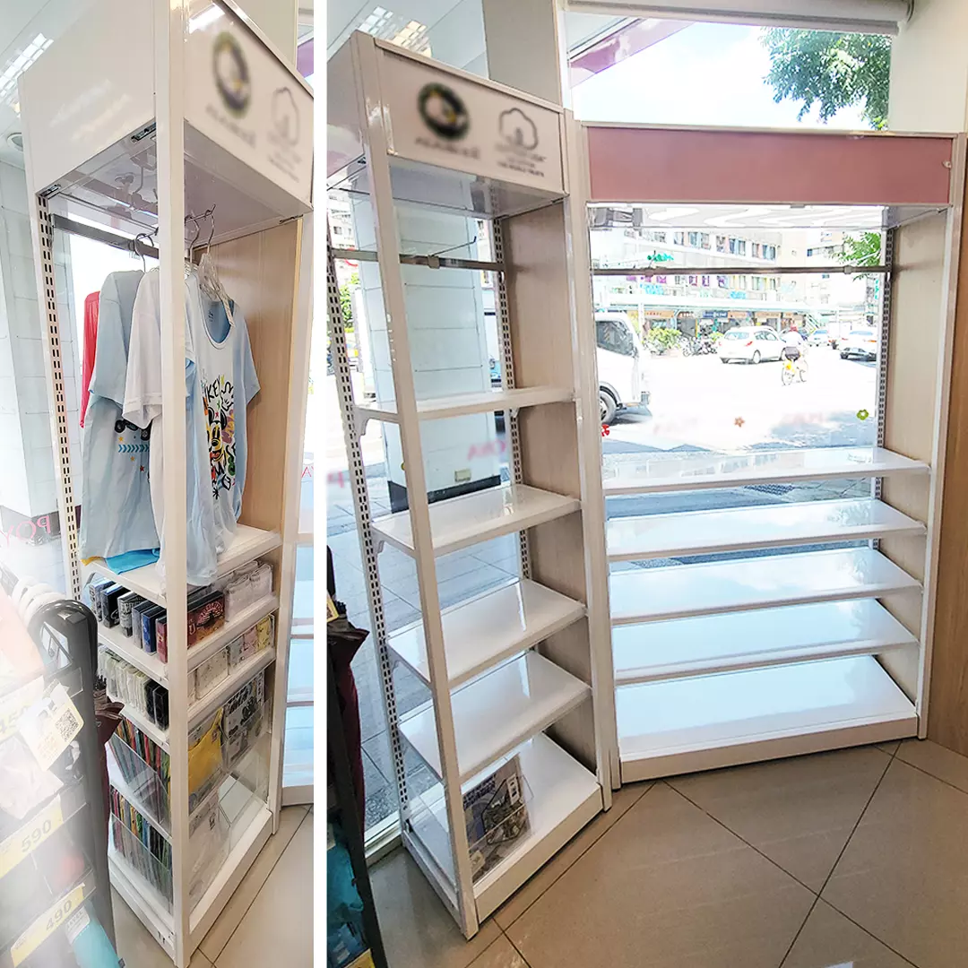 靈活層板結構:可搭配衣架桿、抽屜、層板,滿足多類商品展示。