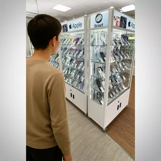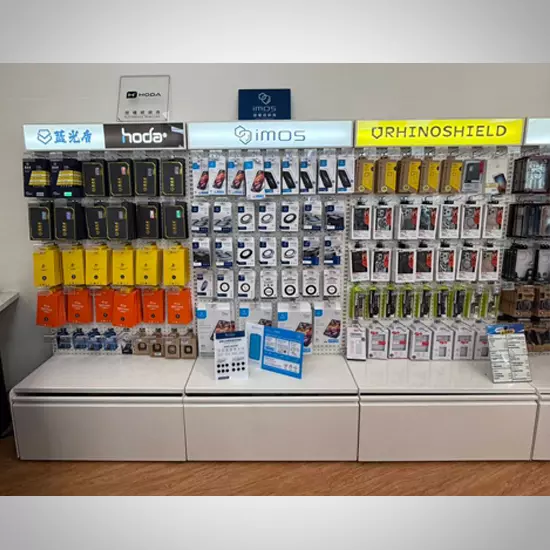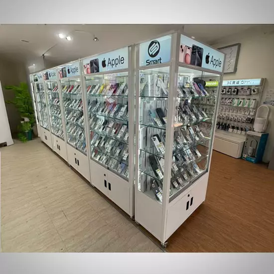 3C用品專賣店常以玻璃展示櫃來陳列高單價或新款手機產品。此類展示方式能有效提升商品價值感,同時保障商品安全,方便顧客近距離觀賞。