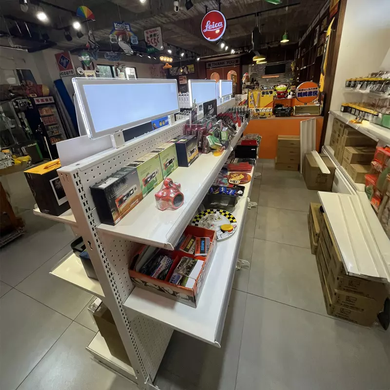 展示架承載著底片、復古相機與懷舊商品一同呈現,乾淨俐落,不搶戲卻為整體質感加分不少。