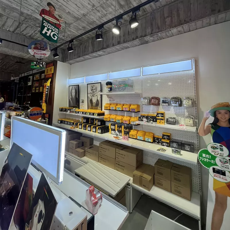 牆邊是琳瑯滿目的底片、復古相機、立可拍與收藏週邊,架上擺設一絲不苟,彷彿每一個商品都是一張膠卷等待曝光。