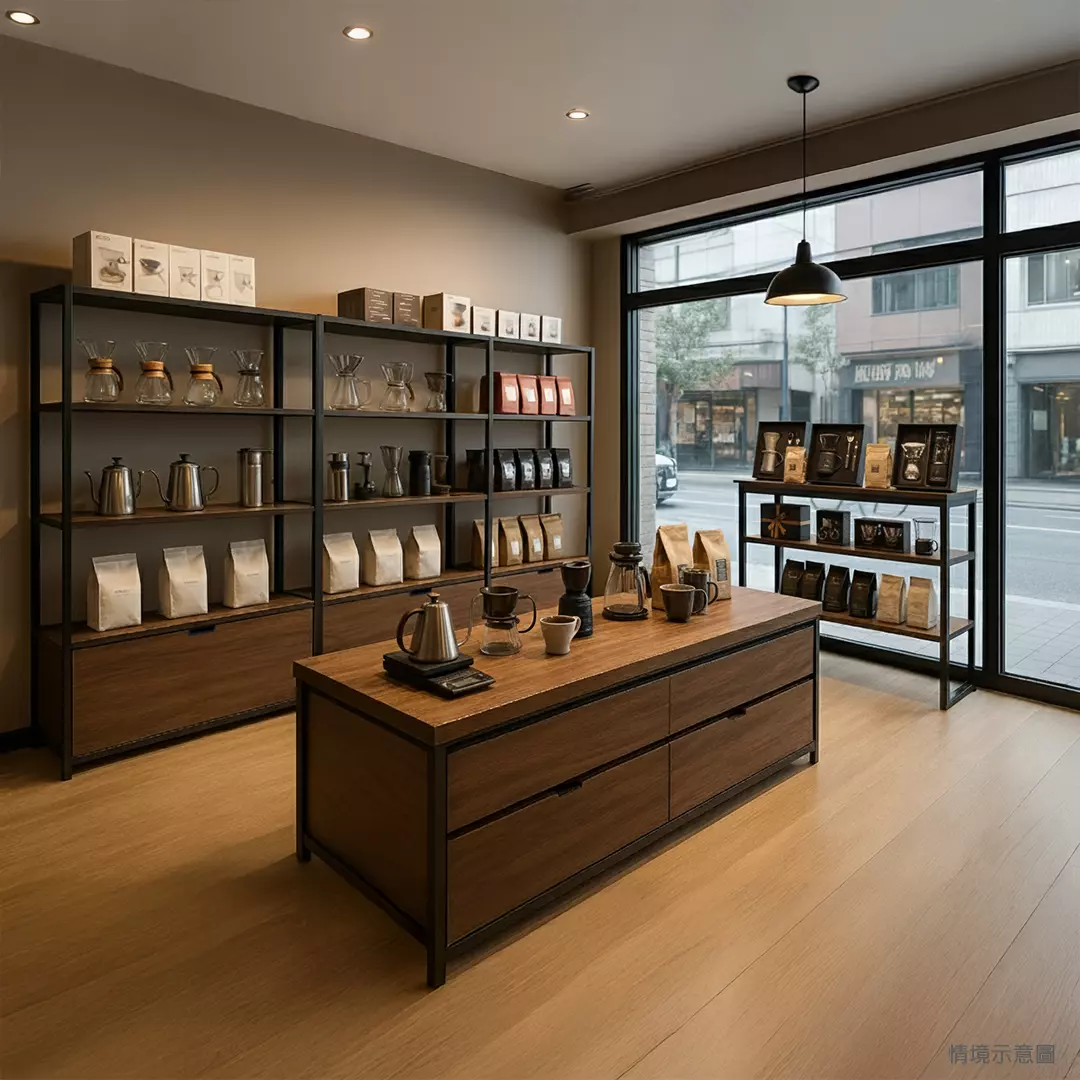 這間咖啡用品店選用了 中日店舖設備的木境壁架,以沉穩木紋結合俐落黑框金屬,打造出兼具功能與美感的展示空間。開放式層架讓商品分類清晰,搭配自然光線映照出層次感,從咖啡豆、濾杯到禮盒包裝,都能整齊陳列、提升視覺焦點。木境壁架不僅是一座展示架,更是品牌氛圍的一部分。