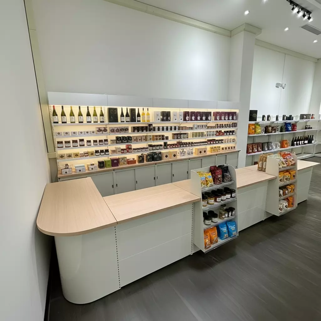 高挑天花板與線性燈軌營造出柔和光感,結合對稱式展示架排列,打造出秩序感與專業度並存的陳列環境。