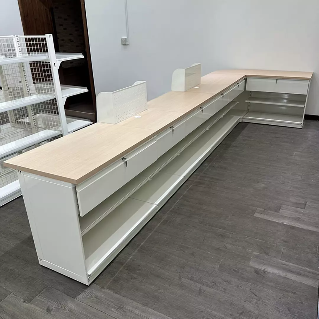 櫃檯採用 圓角木紋造型,柔化金屬線條,延伸出溫潤氛圍。